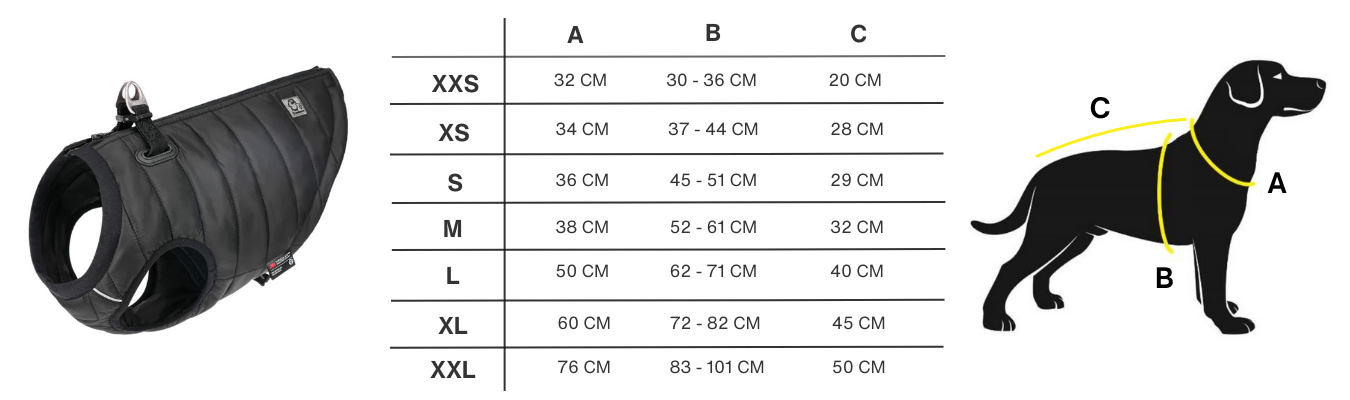 Aby dobrać odpowiedni rozmiar należy zmierzyć psa od łopatki do nasady ogona (C), sprawdzić obwód szyi poniżej obroży (A) oraz klatki w najszerszym miejscu za przednimi łapami (B). Jeśli Twój pies znajduje się na granicy rozmiarów, zalecamy wybór większej kurtki. Jeśli nie jesteś pewny rozmiaru podaj nam dokładne wymiary i wagę psiaka - podpowiemy jaki rozmiar będzie najlepszy.