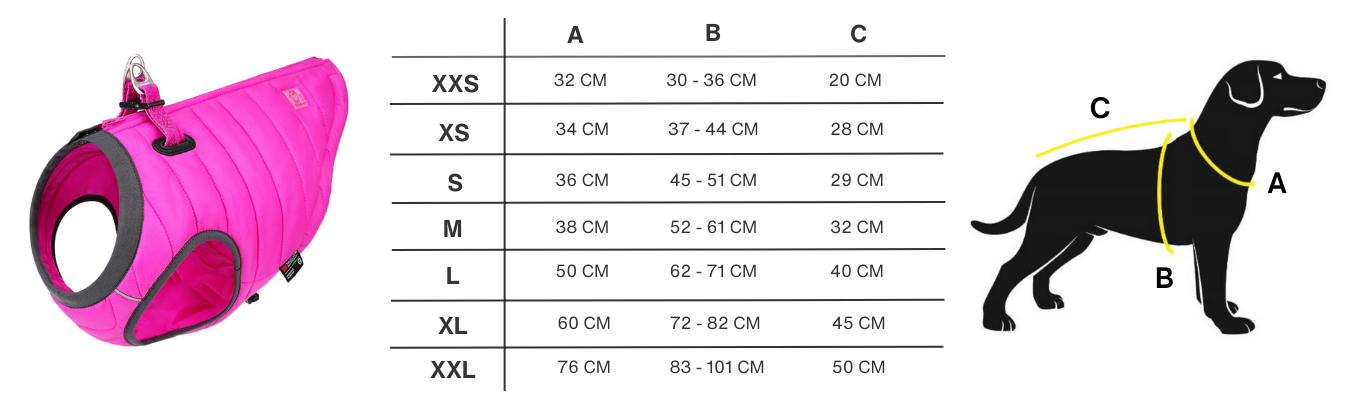 Aby dobrać odpowiedni rozmiar należy zmierzyć psa od łopatki do nasady ogona (C), sprawdzić obwód szyi poniżej obroży (A) oraz klatki w najszerszym miejscu za przednimi łapami (B). Jeśli Twój pies znajduje się na granicy rozmiarów, zalecamy wybór większej kurtki. Jeśli nie jesteś pewny rozmiaru podaj nam dokładne wymiary i wagę psiaka - podpowiemy jaki rozmiar będzie najlepszy.
