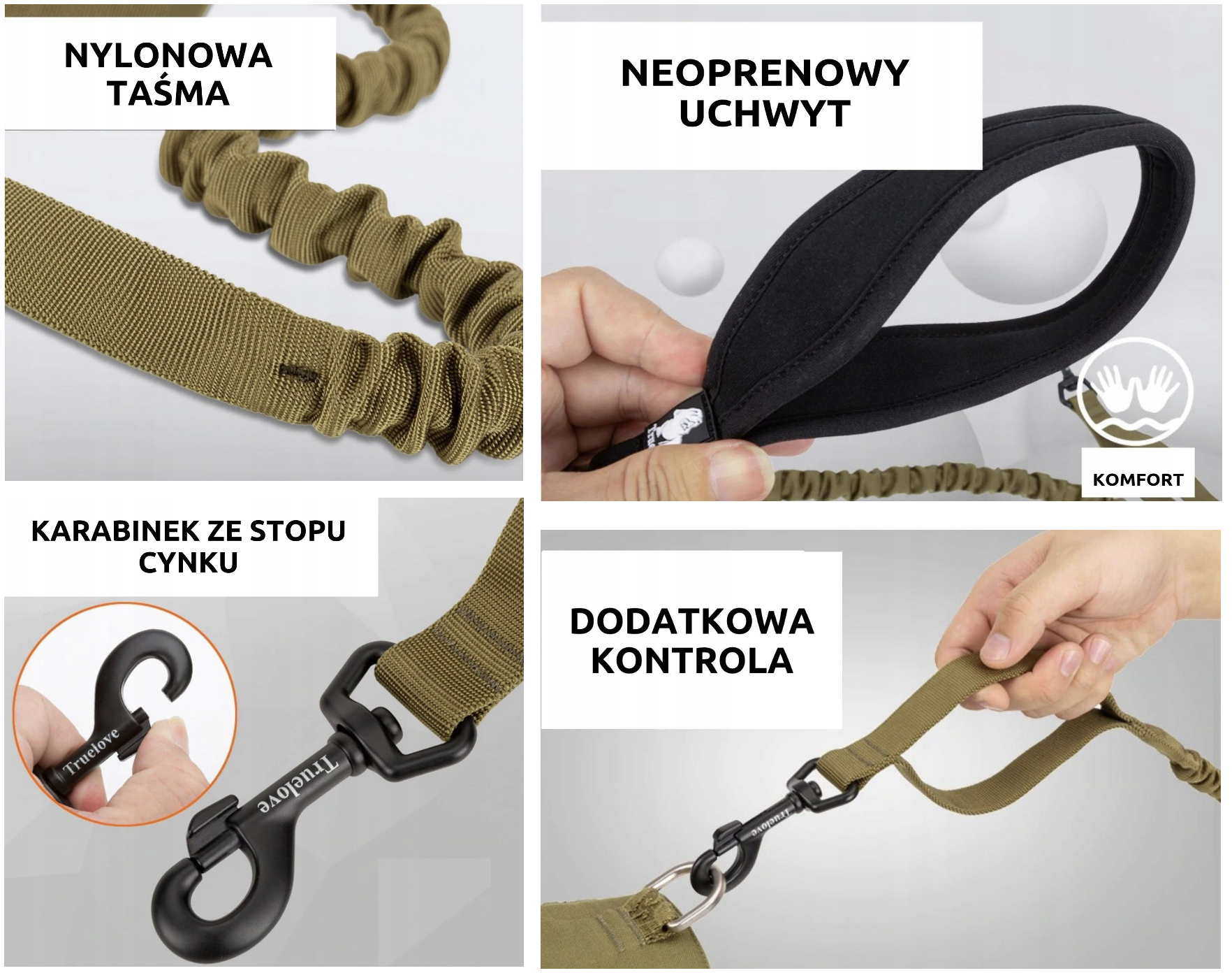 - twardy amortyzator (jeśli szukasz smyczy do biegania, polecamy smycz z miękkim amortyzatorem taki jak: Dogi lub JoQu