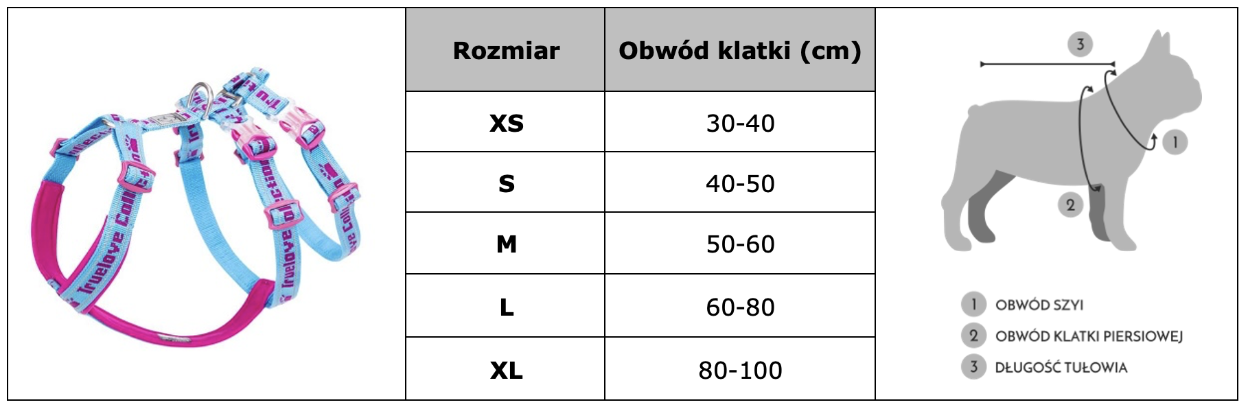 - Jeśli pies znajduje się na granicy rozmiarów sugerujemy wybór większych szelek