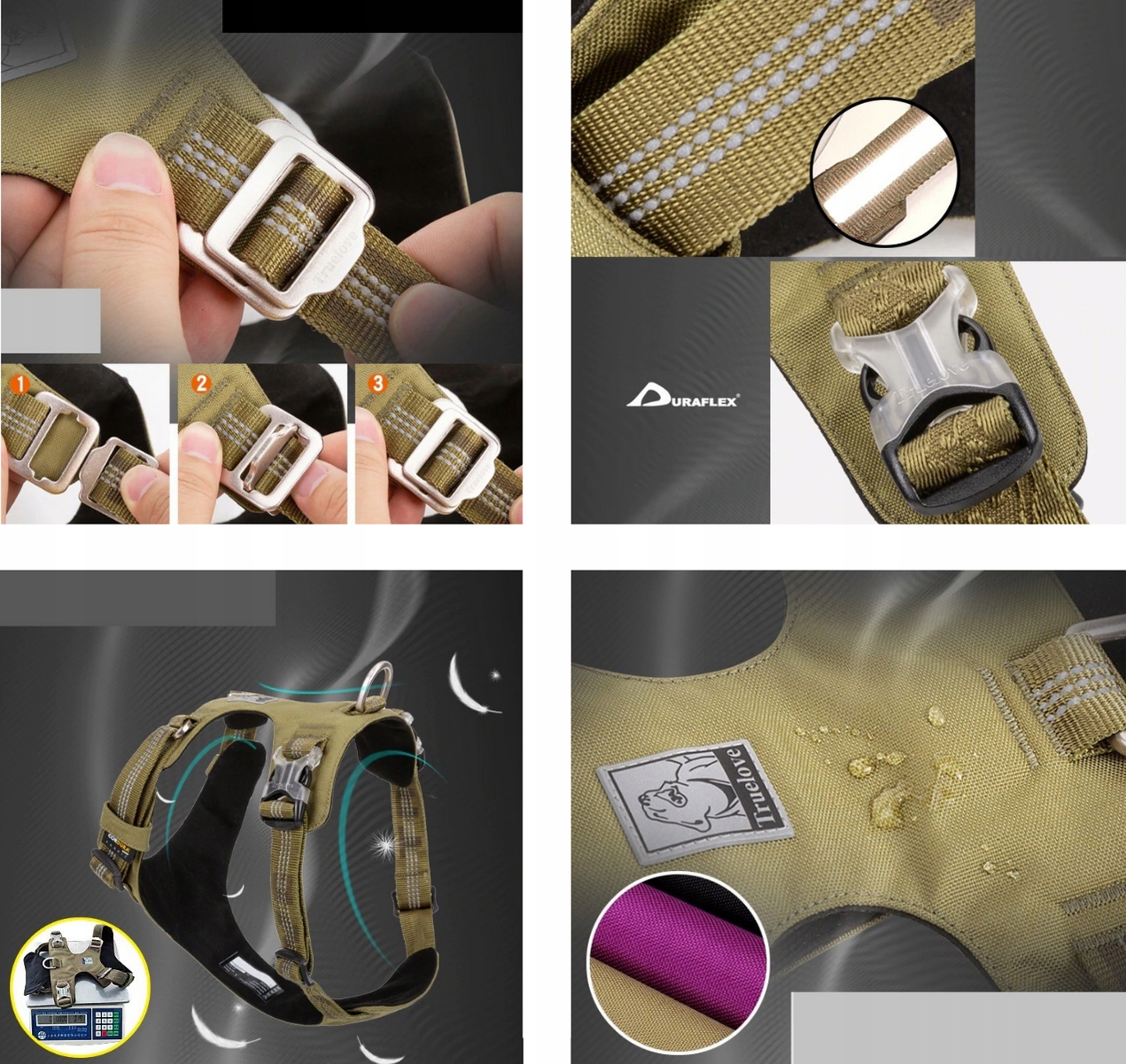 - Wyposażone w aluminiowe zapięcia przy szyi, pozwalające na odpinanie szelek, jak obroży bez konieczności przekładania przez głowę