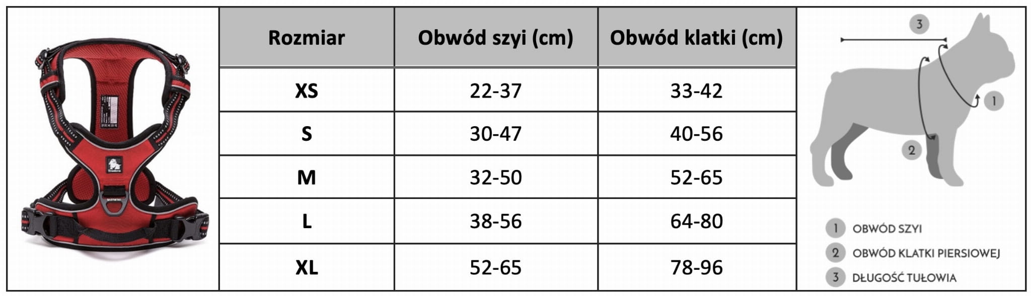 - Jeśli pies znajduje się na granicy rozmiarów sugerujemy wybór większych szelek.