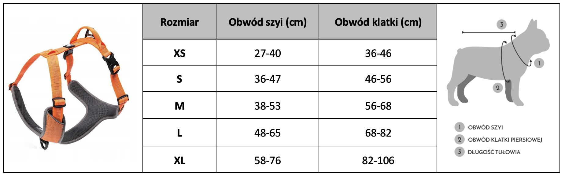 - Jeśli pies znajduje się na granicy rozmiarów sugerujemy wybór większych szelek.