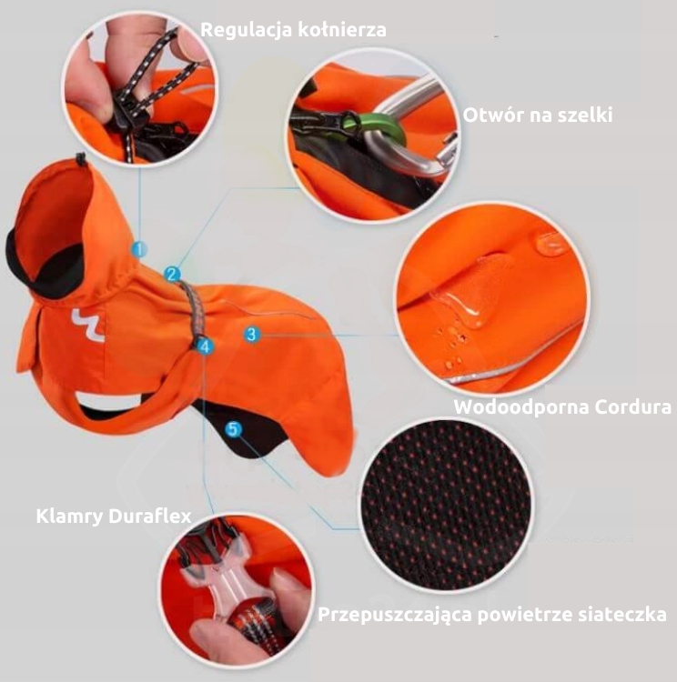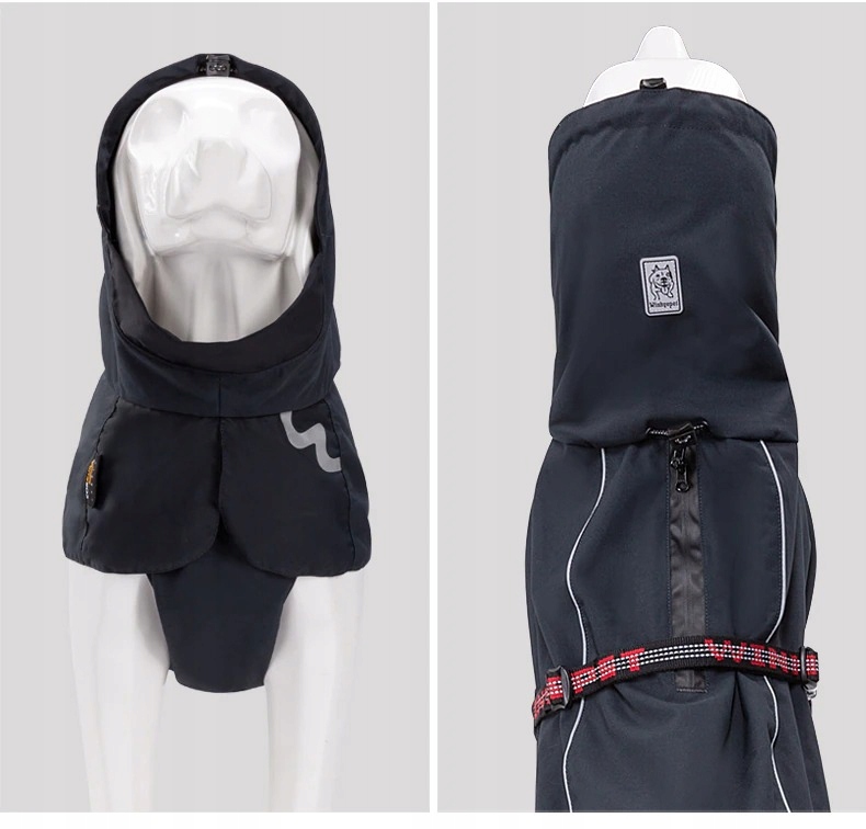 Profesjonalna kurtka dla psa, która ochroni go przed najtrudniejszymi warunkami atmosferycznymi. Wodoodporna i wiatroszczelna Cordura jest odporna na zadrapania, a więc przebieżki po krzakach i trudnym terenie nie są jej straszne. Wielofunkcyjny, szeroki kołnierz może pełnić funkcję kaptura osłaniając głowę i uszy psa lub po zsunięciu szyję psa. Wyprofilowany tył derki z dodatkowym zapięciem pod ogonem pozwala na osłonięcie delikatnych części ciała psa. Na grzbiecie specjalny regulowany otwór, dzięki któremu derkę możesz narzucić na szelki.