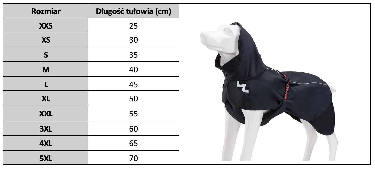 - Najdokładniejszy pomiar uzyskamy sprawdzając długość od szyi (okolicy międzyłopatkowej) u psa do nasady ogona. Miejsce pomiaru do prawidłowego wyboru rozmiaru derki dla psa wskazuje grafika znajdująca się na tabeli rozmiarów.